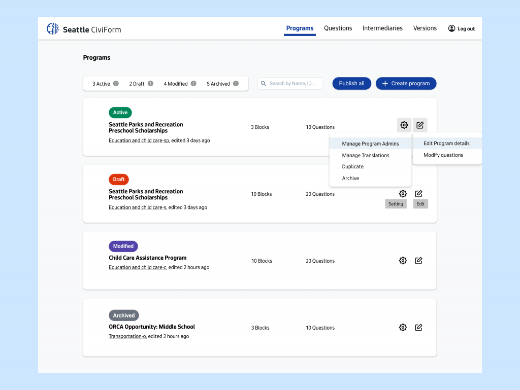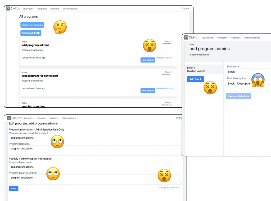 The whole content management system is built from scratch. When I joined the team, the civiform admin platform was on the progress of development. The Q1 designer has done the foundation design, he focuses more on the civiform admin part than the application side.